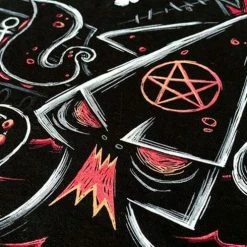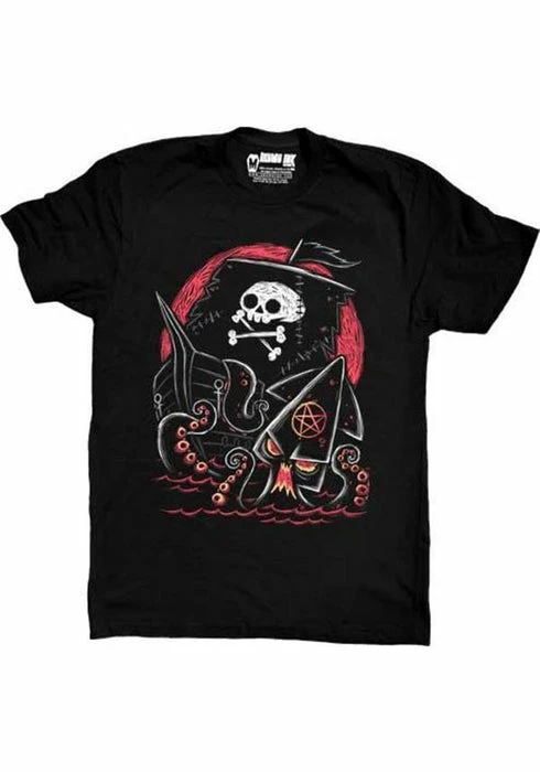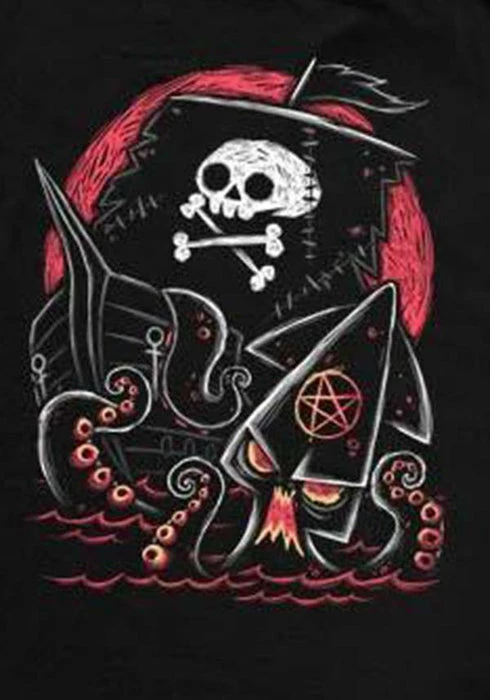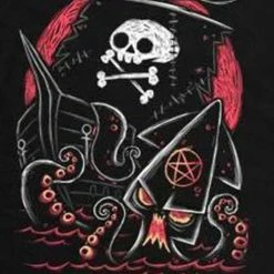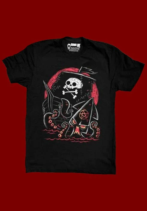 Original hand-drawn artwork of Cthulhu. With a coffin logo on the back near the neck like a signature on every shirt.