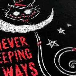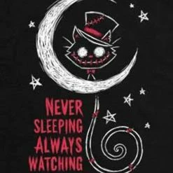 Original hand-drawn artwork of ALWAYS WATCHING, depicting a creepy Cheshire cat, who will never let you out of his sight, ever. With a coffin logo on the back near the neck like a signature on every shirt.