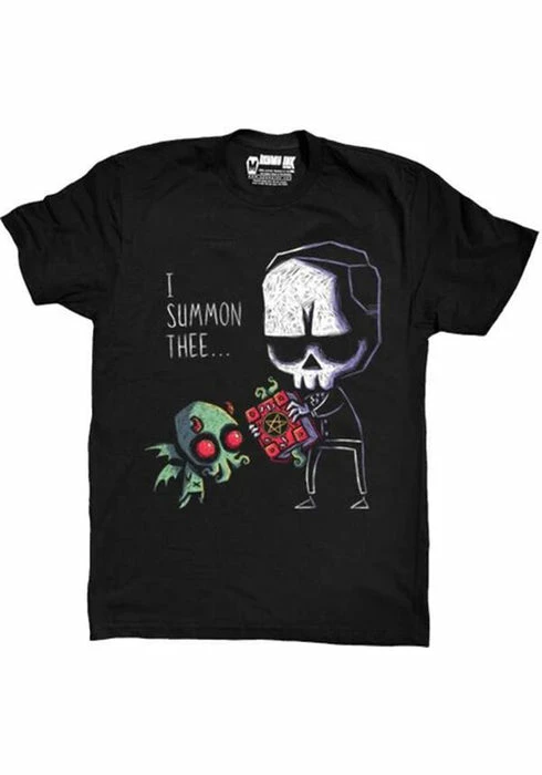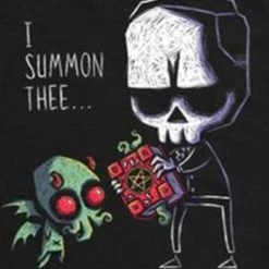Original hand-drawn artwork featuring a creepy animation style skull-man and spell book with the written words “I Summon Thee’. There’s a weird baby Cthulhu thing too.