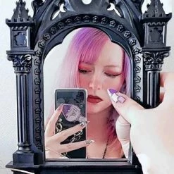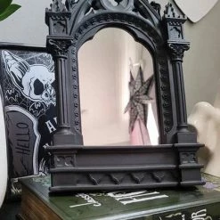 An ornate gothic mirror hand finished in the finest quality black resin. This mirror can be wall hung or free standing.