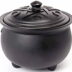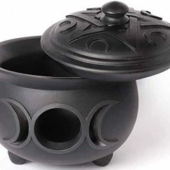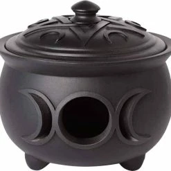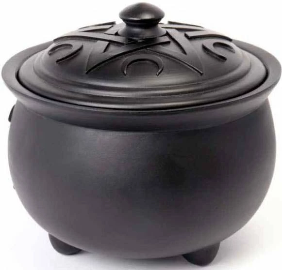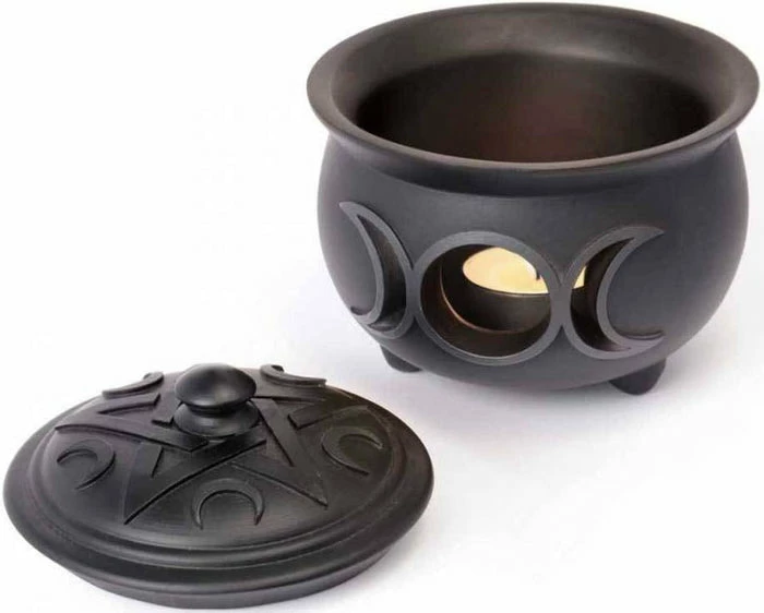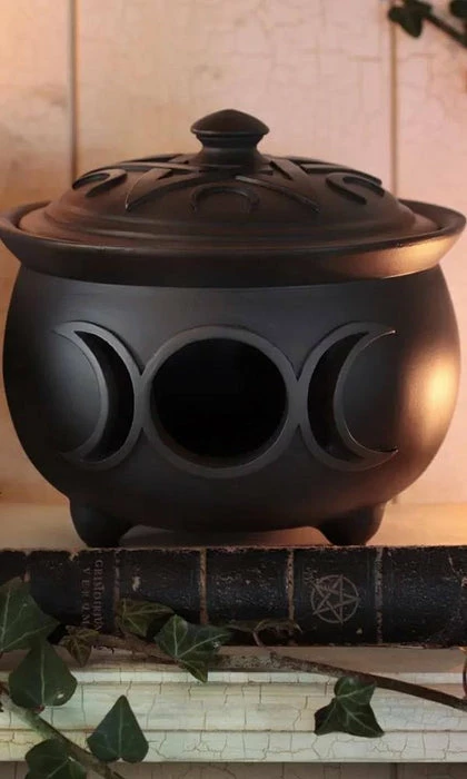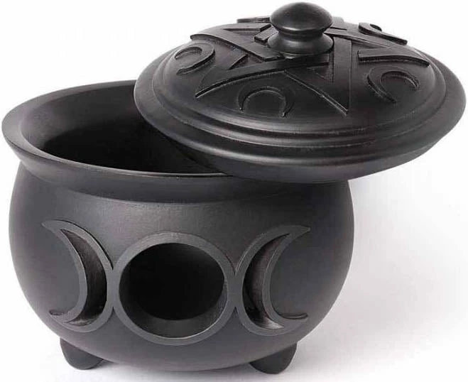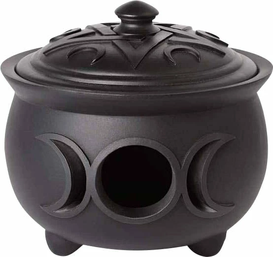 A finest quality resin pot with triple moon cut out detail and pentacle and moon detailed lid.