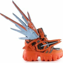 Suit up and add a touch of Japanese mecha to your next look! These incredible bright orange hidden wedge sneakers are inspired by Mobile Suit Gundam and features statement wings and shield! The perfect pair of state sneakers for a weeb or just a sneakerhead!Â