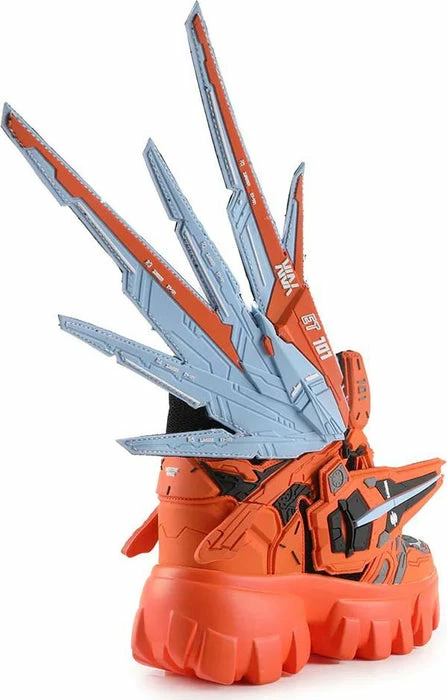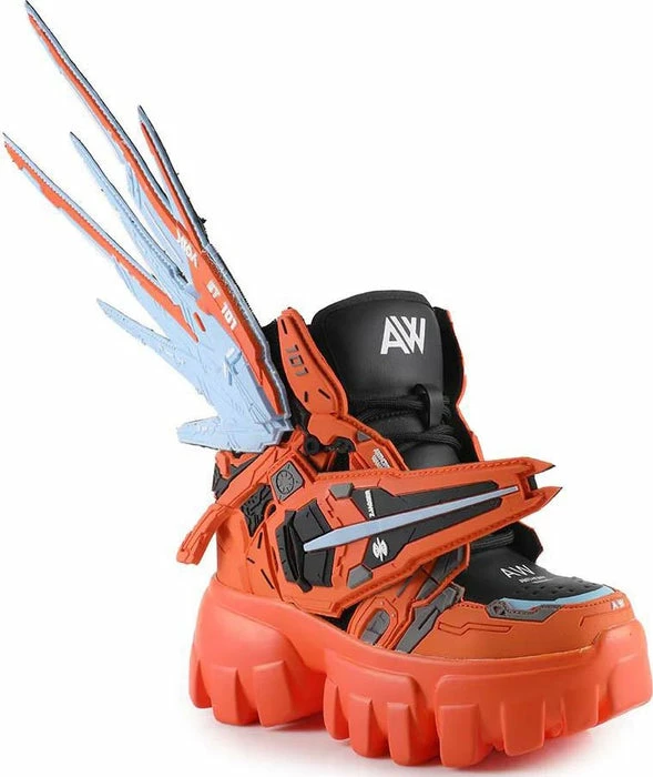 Suit up and add a touch of Japanese mecha to your next look! These incredible bright orange hidden wedge sneakers are inspired by Mobile Suit Gundam and features statement wings and shield! The perfect pair of state sneakers for a weeb or just a sneakerhead!Â