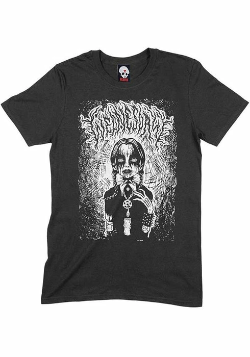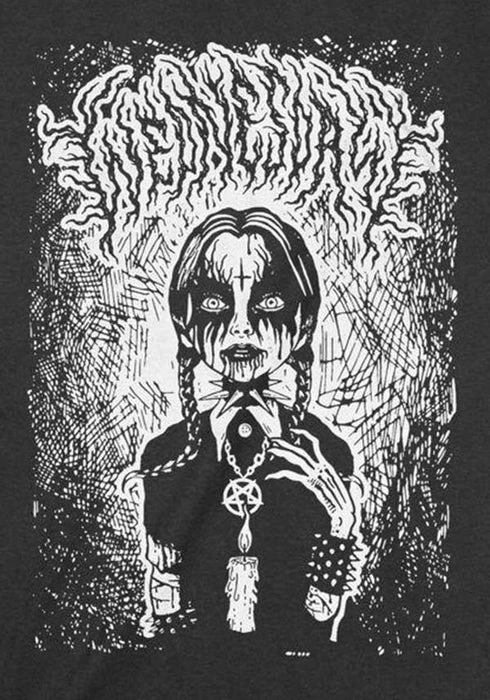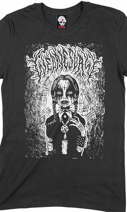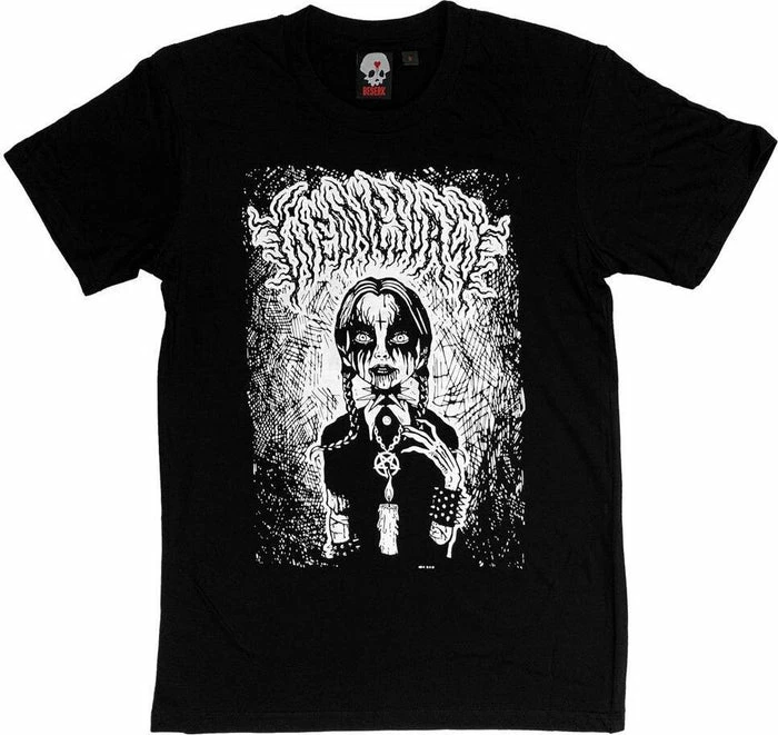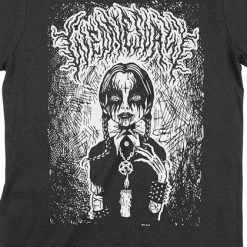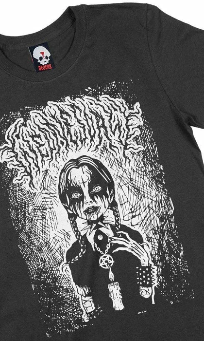 Beserk has come together with Freelance Artist, Naybahood from Italy for this amazing Wednesday inspired crew neck t-shirt! Featuring a screen printed Wednesday looking like she came straight out of a heavy metal music video. Bringing a fresh view of the Wednesday we love!Â