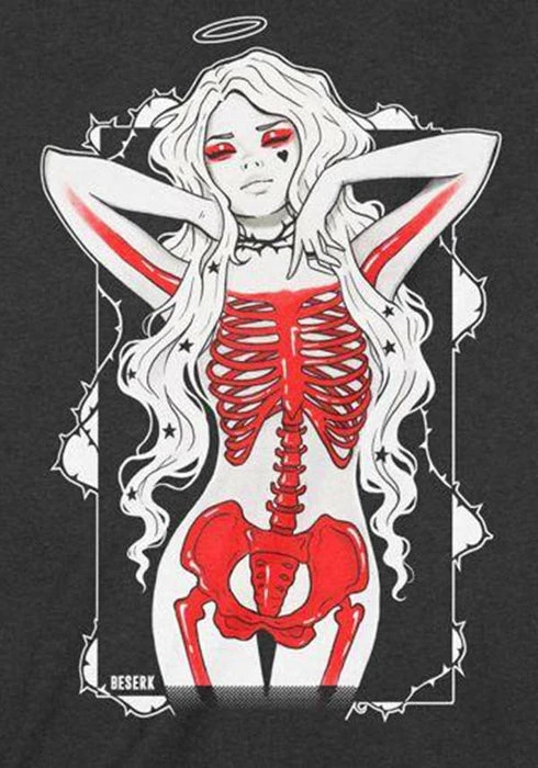A cute dark design from Beserk Clothing, this top is made from super soft cotton, ultra comfortable and top quality! Features a bold graphic screen print that is part gothic and all killer!