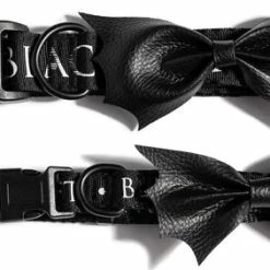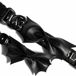 Blackcraft logo dog collar with adjustable straps and buckle clip closure. Includes textured bat wing bow and D-ring for leash clip.