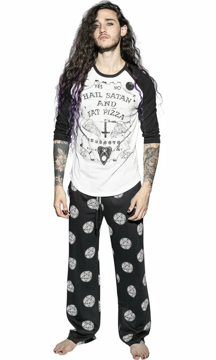 With an awesome bold printed design on the top and the bottoms, you can now express your affiliation with the three greatest things ever: Pizza, Sleep, and Satan.