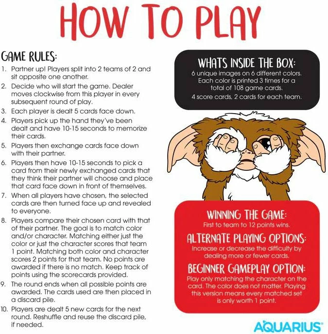 Put your memory to the ultimate test with your fellow fans at your next game night party with this incredibly entertaining Gremlins card game that the whole family can enjoy. Loved by all, this Gremlins card game is the ultimate gift for fans of all ages. Perfect gift for birthdays, white elephant, stocking stuffers and Winter Holidays