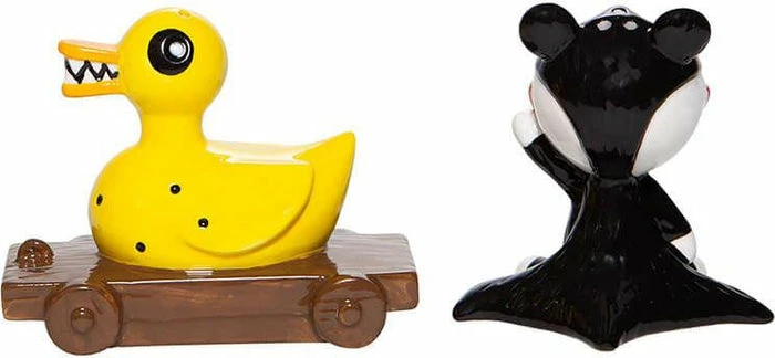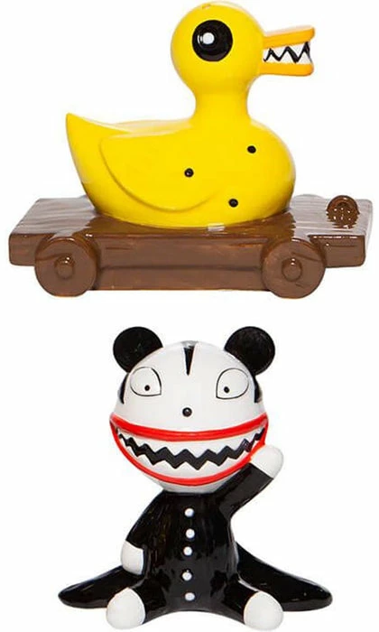 From The Nightmare Before Christmas comes this Scary Teddy and Killer Duck salt and pepper shaker set. Crafted from dolomite, these two companions are sure to make a spooky statement during mealtime!ย