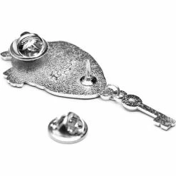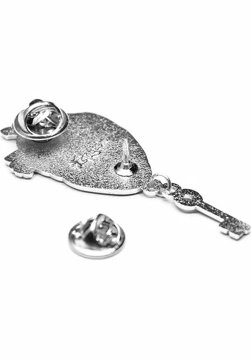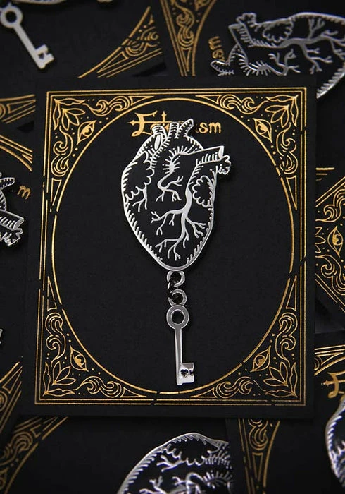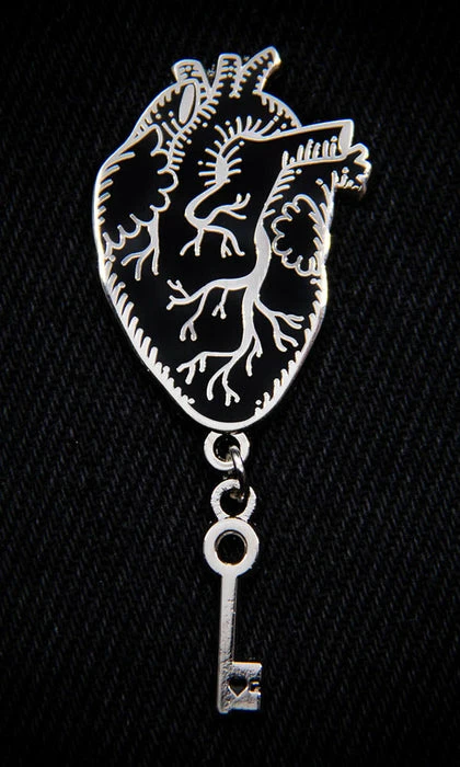 This vintageย medical illustration inspired enamel pin features an anatomical heart with a hanging key charm. Made withย silver metal andย black enamel, it makes aย spooky accessoryย to pin on your jacket.