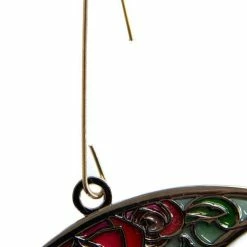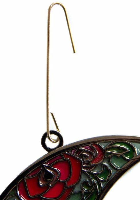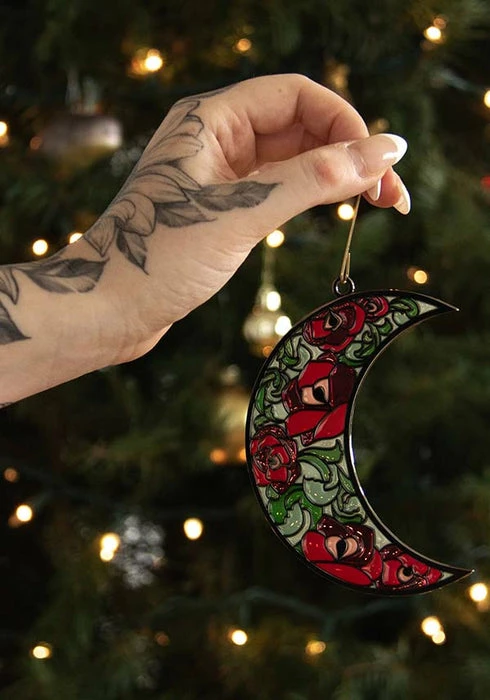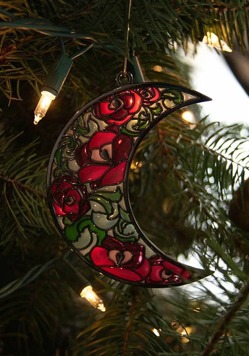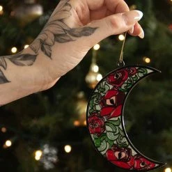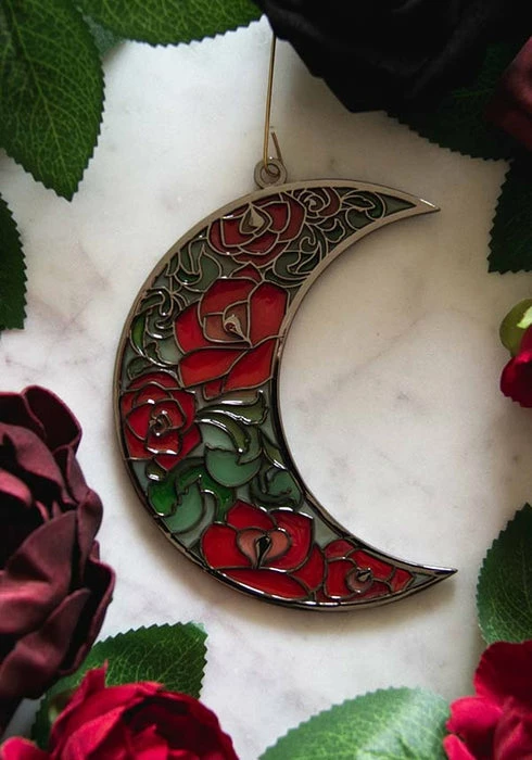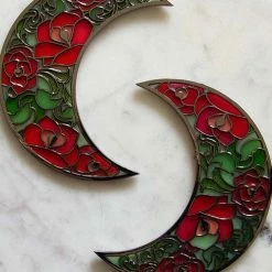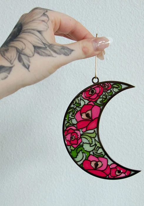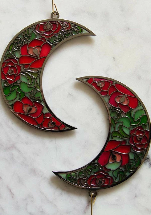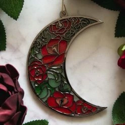 This stunning sun catcher features a red and green rose filigree pattern inside a crescent moon shape. The translucent, stained-glass effect looks stunning hung in a window to decorate your home with witchy, boho style. This beautiful ornament is truly a collectible!Â