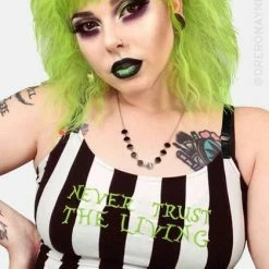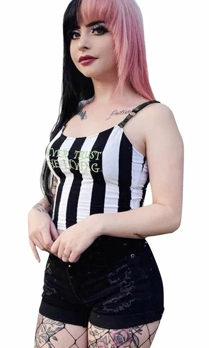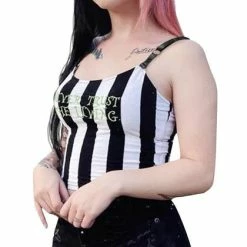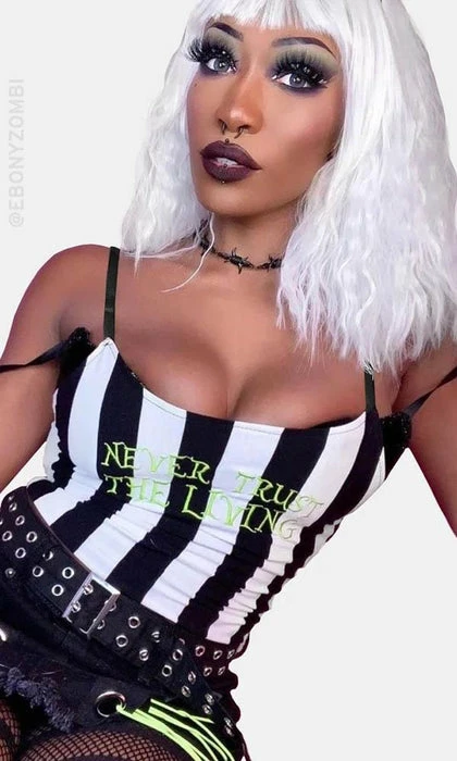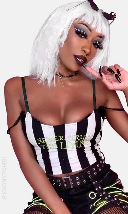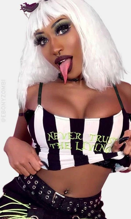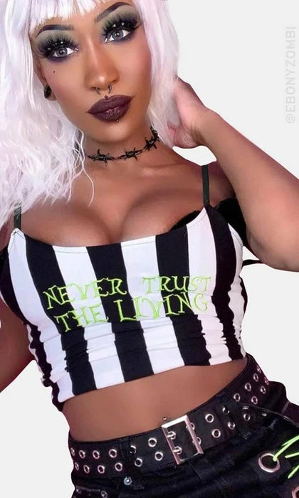 This super cute cropped top has just the right amount of stretch for a perfect fit. It features embroidered detail and a cute little spooky branded tag in the bottom right corner.