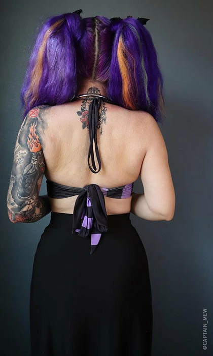 This super cute halter top has just the right amount of stretch for a perfect fit. It ties in the back and around the neck and can easily be adjusted. The Nightmare Halter top also has a cute little spooky branded tag in the bottom right corner.