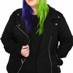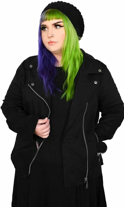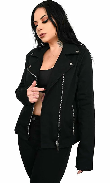 A slightly oversized stretch black denim motorcycle jacket just begging for all your pins and patches. A perfect blank to customize to your personality.Â