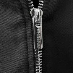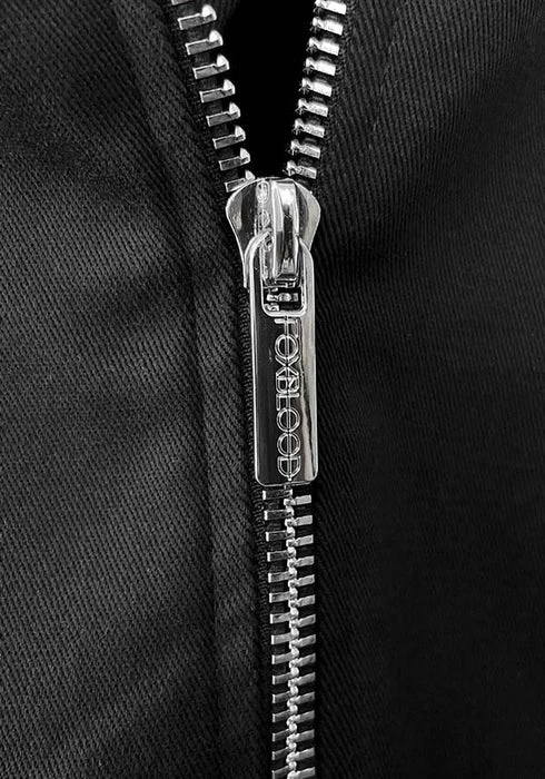 Silver color heavy metal zippers with FOXBLOOD branding. Zipper pockets and zipper cuff detail.Â