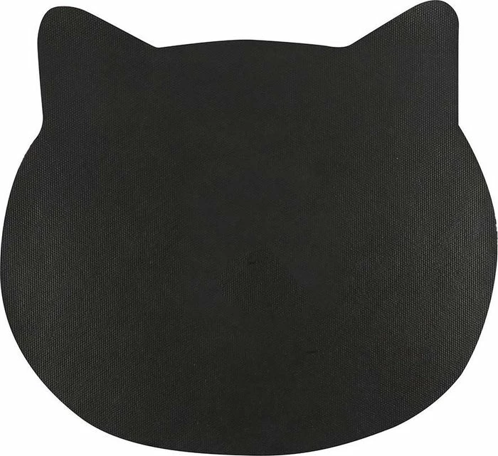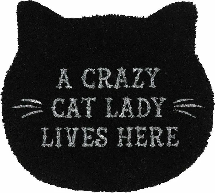 A black coir doormat shaped like a cat face with ‘A Crazy Cat Lady Lives Here’ text and printed whiskers.