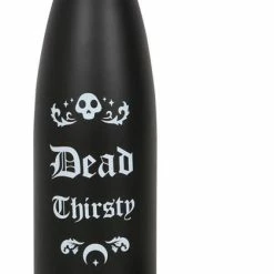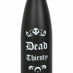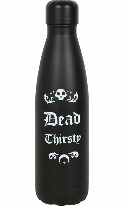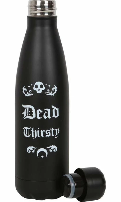 This metal water bottle features the text ”Dead Thirsty” in white gothic themed text which stands out boldly against the black bottle. The bottle features a screw on cap to prevent any spillages.Â