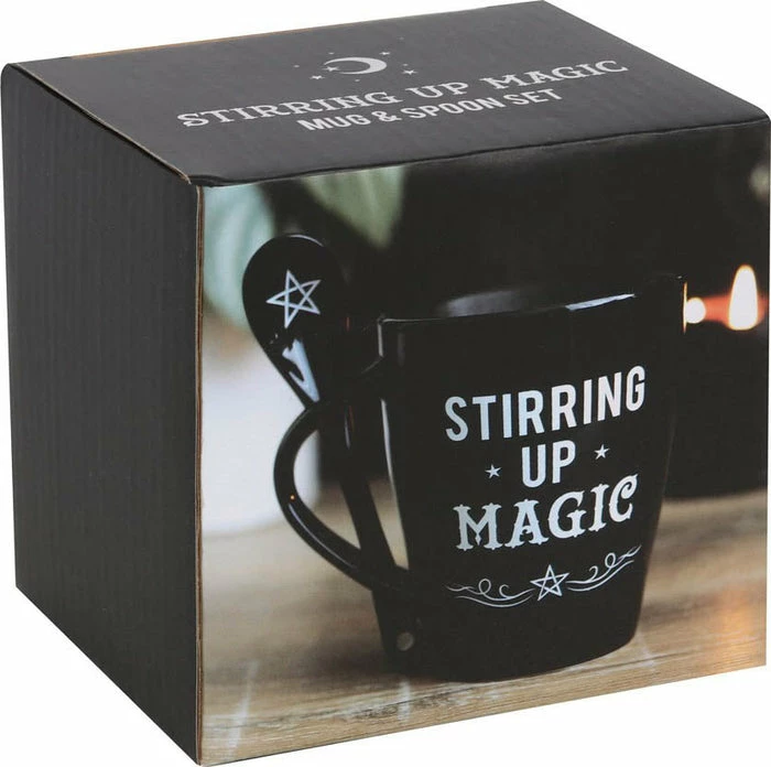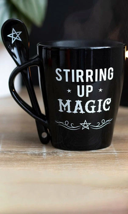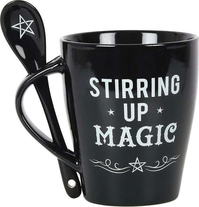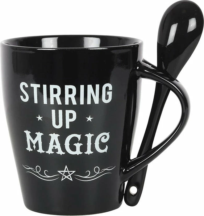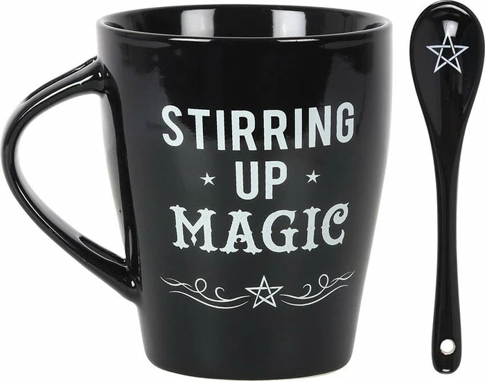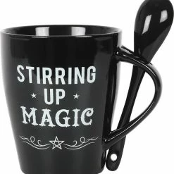 This bewitching mug and spoon set will add a pinch of magic to every cuppa. Style features ‘Stirring Up Magic’ text and matching teaspoon with a pentagram design that fits perfectly in a slotted handle.