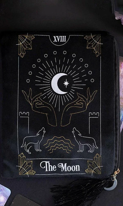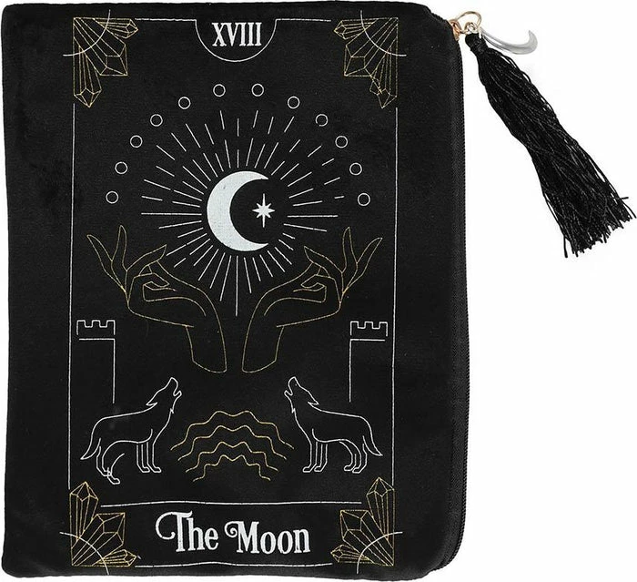 This velvet zipper pouch is the perfect place to keep tarot decks, crystals, beauty products and other treasures. Features a stunning white and gold moon tarot card illustration on the front and a matching tassel and crescent moon charm on the zipper.Â