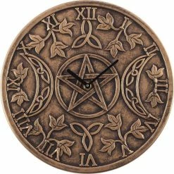 Beautifully crafted terracotta clock featuring a triple moon design by artist Lisa Parker. The clock has a bronze painted effect and requires 1 AA batteryÂ