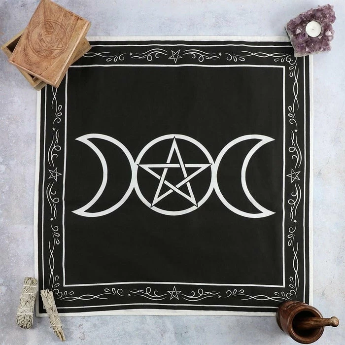 Channel the power of the mother, maiden and crone with this cotton altar cloth with printed triple moon and pentagram design. A flourished white border finishes off this contemporary style.