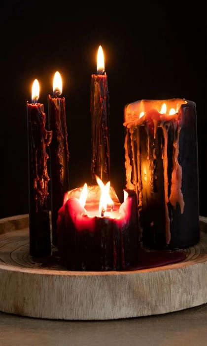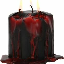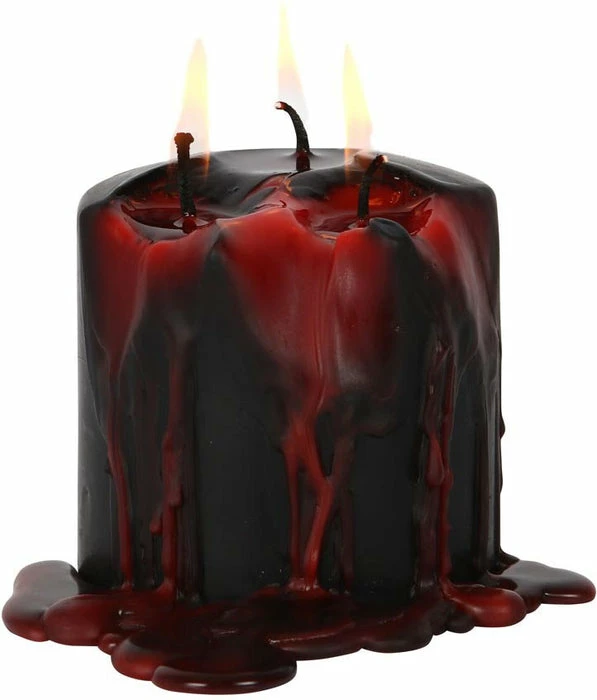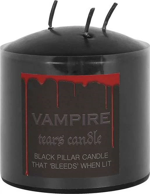 This pillar Vampire Tears candle gets its name from the bright red coloured wax which melts and drips after lighting the wicks. Made from paraffin wax the candle has three wicks for even burning and has an approx burn time of 15 hours.