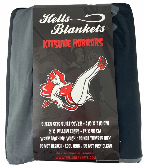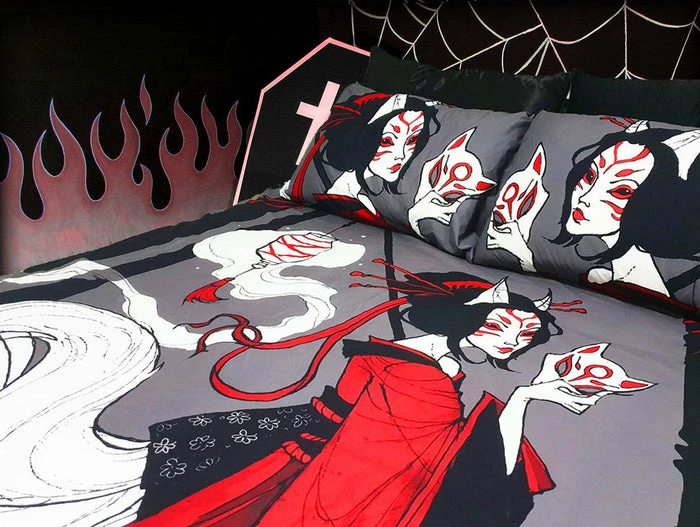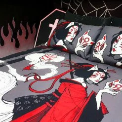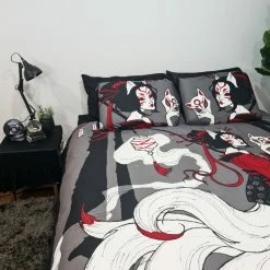 Theย Kitsune Horrorsย Quilt Setย bringsย enchantingย andย macabreย vibes to the bedroom.ย Featuringย a Japanese Nine Tailed Foxย designย – perfect for anybody who likes to doze on the deadly side!ย