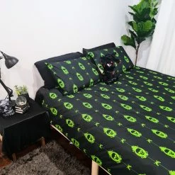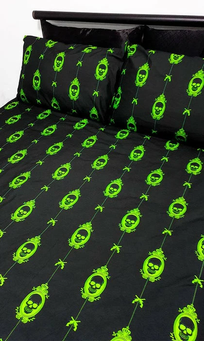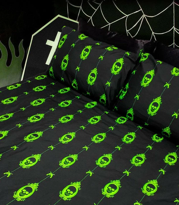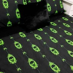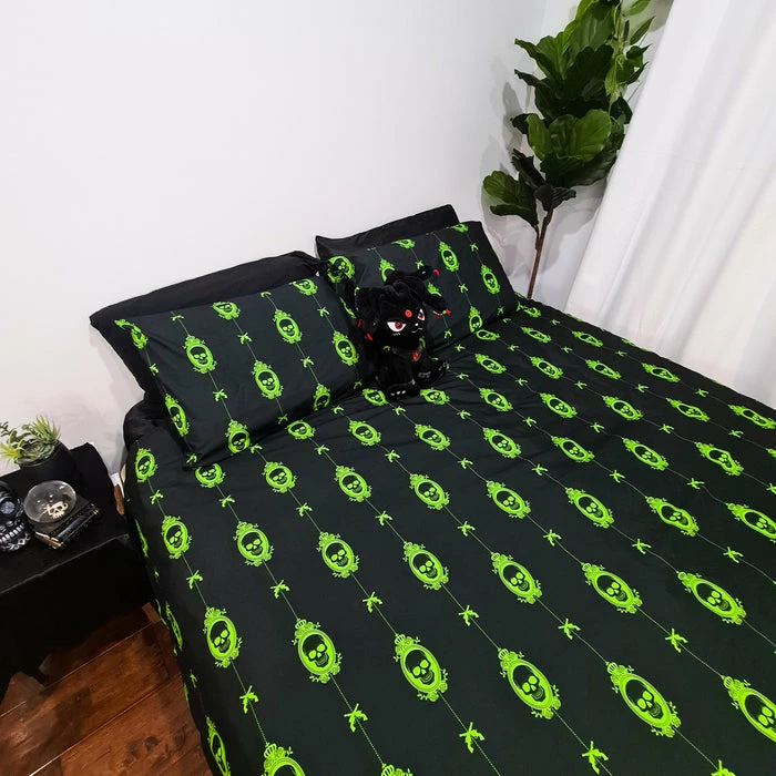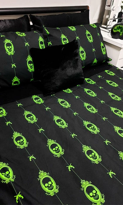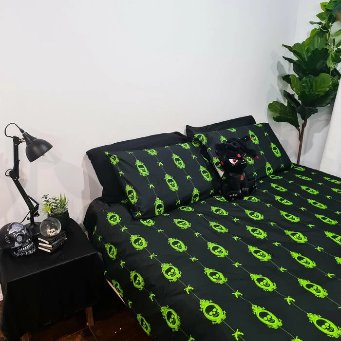 The Poison Nightmare Quilt Set brings creepy and macabre vibes to the bedroom. Featuring skulls print design – perfect for anybody who likes to doze on the deadly side!Â