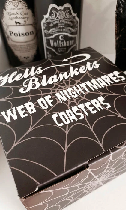 The Web Of Nightmares Coaster Set from Hells Blankets is a must-have for anyone who loves to embrace the darker side of life. It’s perfect for adding a touch of horror to your home or for using year-round to satisfy your love of all things spooky.