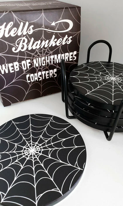 Introducing the Web Of Nightmares Coaster Set from the sinister label Hells Blankets, a set of coasters that will add a touch of terror to your home décor.