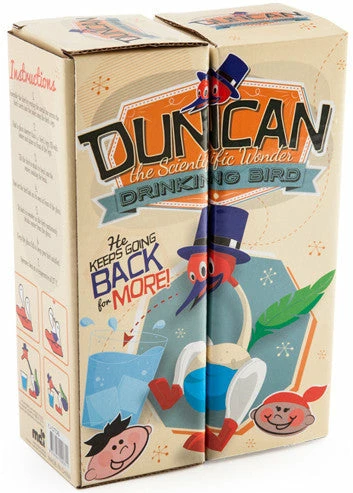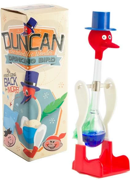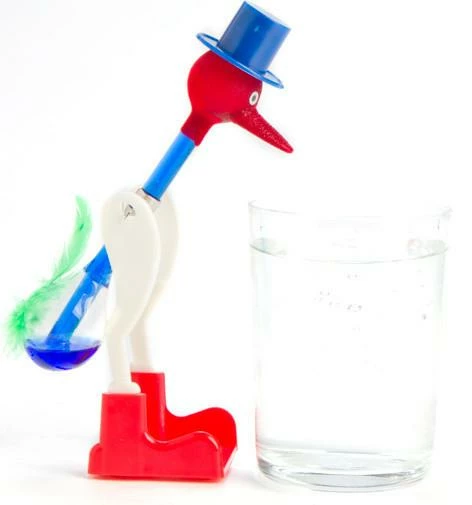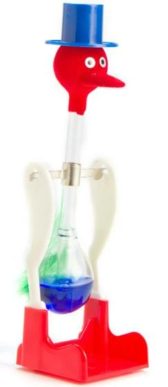 This classic novelty drinking bird is a scientific wonder. This seemingly simple device uses the principles of thermodynamics to maintain a constant bobbing motion.
