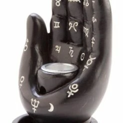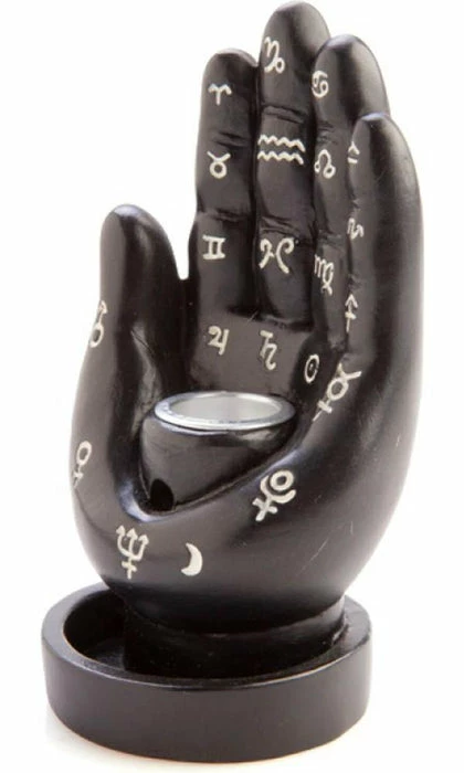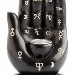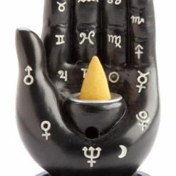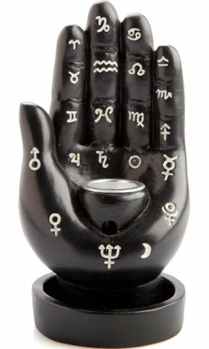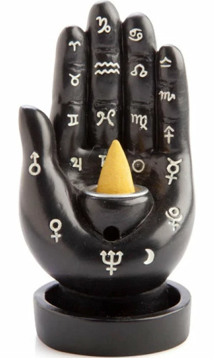 This black backflow incense burner features a stylised Hamsa hand design with astrological symbols on the fingers and palm which add a celestial touch.