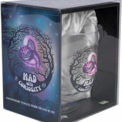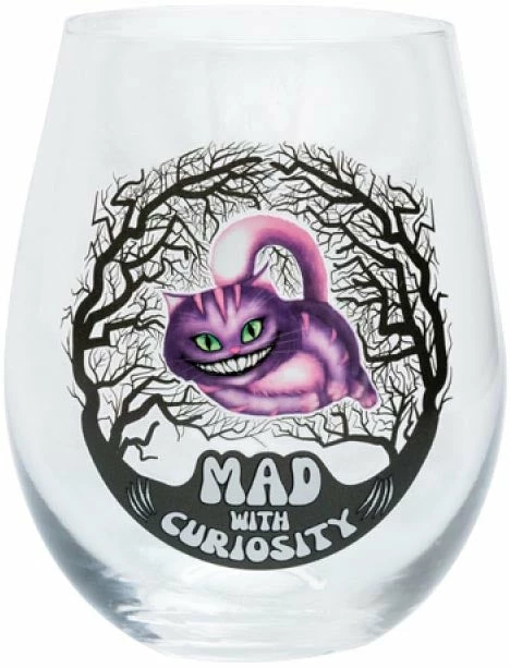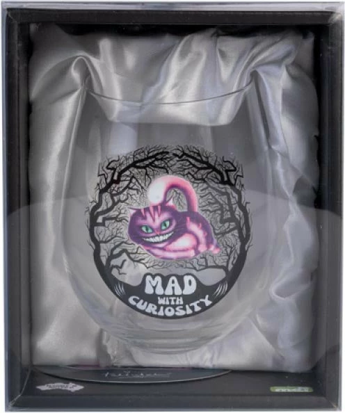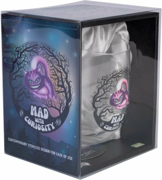 Hand-blown stemless glass featuring mystical forest scenery and a curled up mad cat. Bubble letters read ‘Mad With Curiosity’.Â