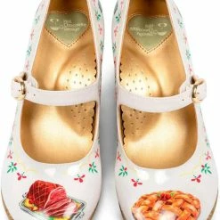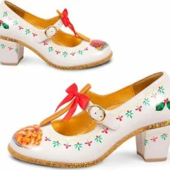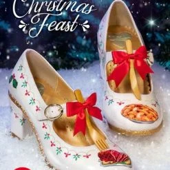 Say what you like…. but don’t say I am late to Christmas dinner! Get your knife and fork ready to dig into these delicious white patent finish mid heels, decorated with everyone’s faves from Christmas Feasts – glazed ham, and a big beautiful pie…. all gilded in golden glitter. Get your feast on!