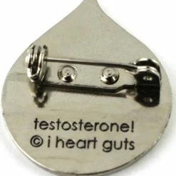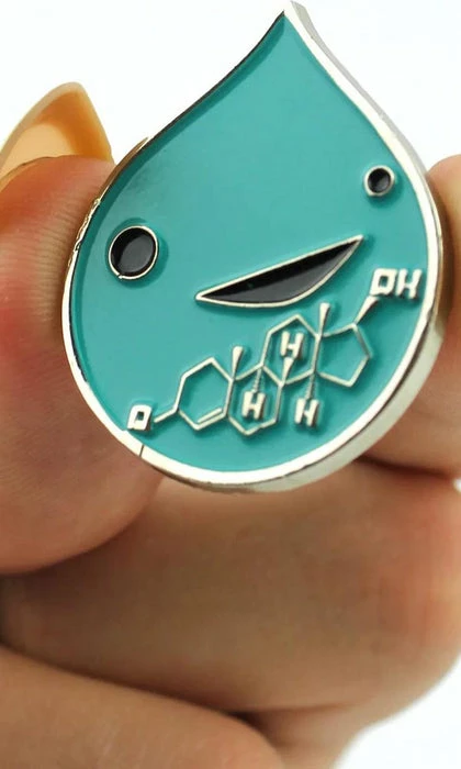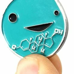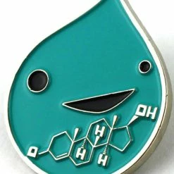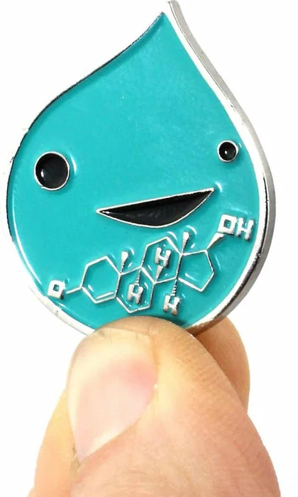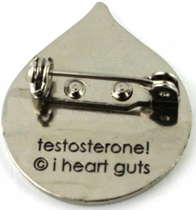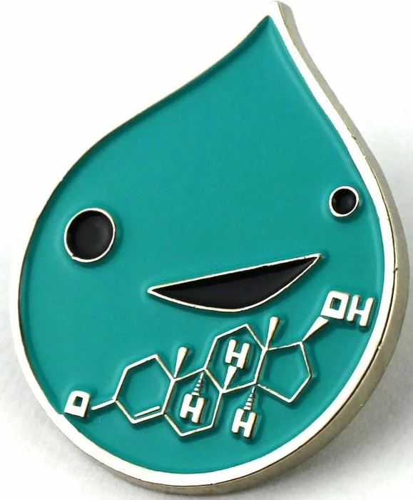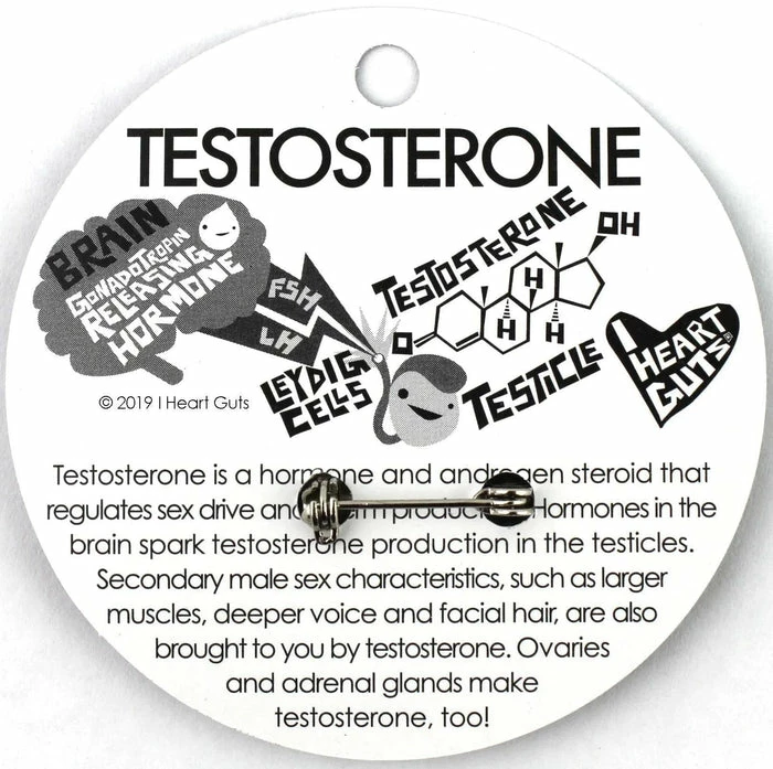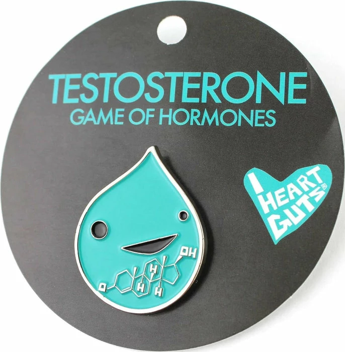 This enamel pin features testosterone art showing the molecular structure of the hormone, which is made by various glands in the body. Secondary sex characteristics, such as larger muscles, a deeper voice and facial hair, are also brought to you by testosterone. Ovaries and adrenal glands make small amounts of testosterone, too! Soft enamel zinc alloy pin