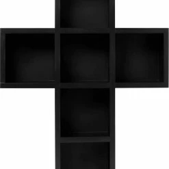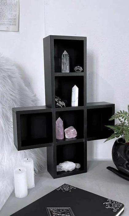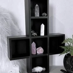 Practical and stylish wooden cross shelf, all black to match your soul. Perfect for storing your magical objects, crystals, candles or simply just decorate your wall.