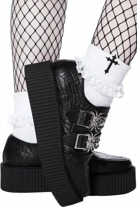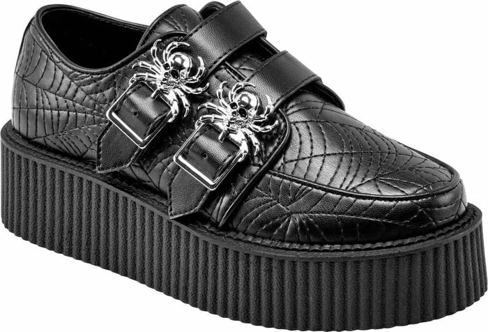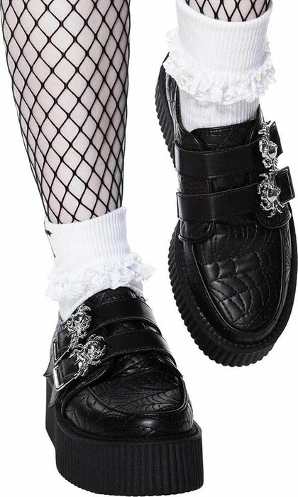 The Dead ‘n’ Buried creepers are made in a high-quality vegan leather body, with straps to the front, silver hardware and statement spiderweb pattern. Leather piping details and complete with a 5cm platform sole. Ready to rock with your coven, nights out, or just doing day-to-day stuff out the crypt.