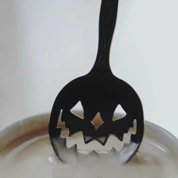 Style:ย Tea Spoon, featuring cutouts for at the base for the jack-o-lantern eyes, nose, and mouth.