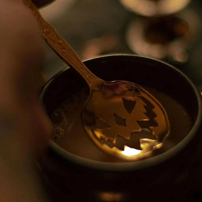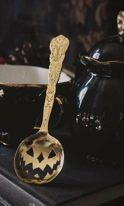 Haunted Hallows. The official Jack-O-Lantern of Lively Ghosts. This 6″ spoon features intricate design-work on the handle — including crescent moons and a Victorian-inspired filigree — as well as a cutout jack-o-lantern design for the base. Perfect for mixing libations such as tea, cocktails, poison, and the like.Â
