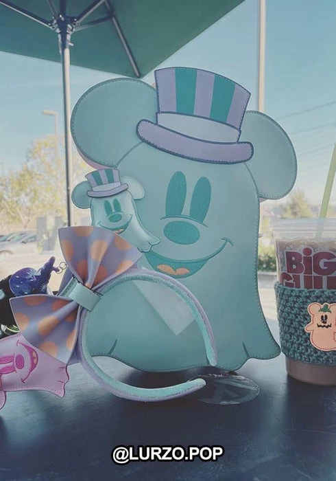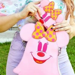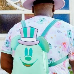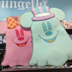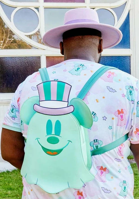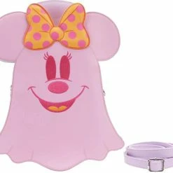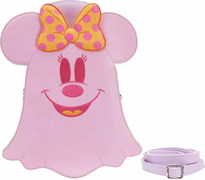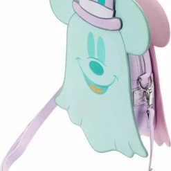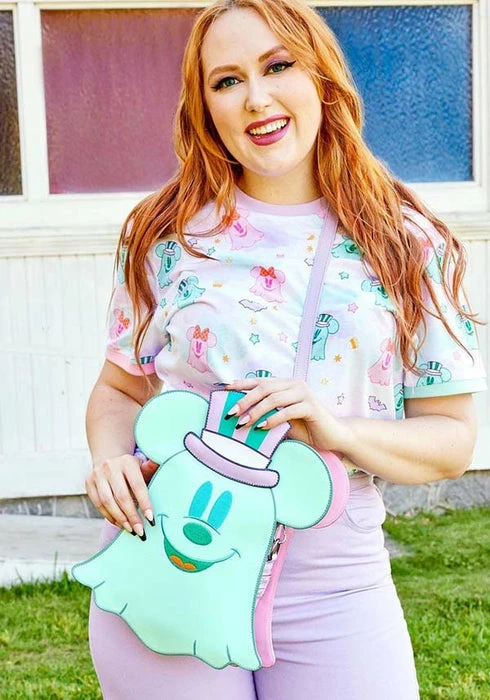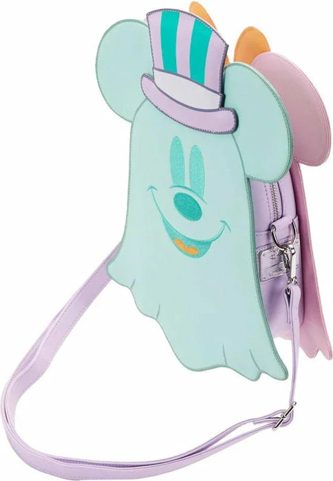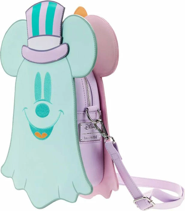 Boo-tiful adventures await with this Loungefly Disney Pastel Ghost Mickey Mouse and Minnie Mouse Glow-in-the-Dark Double Sided Crossbody Bag. Pack just what you would need for a fun and spirited trip! On the front of this figural crossbody bag, applique details bring Minnie Mouse, as a pink ghost, to life. Her otherworldly ears stick up over the top of the bag, and an orange bow, sprinkled with pink polka dots, adds a terrific twist to Minnie Mouse’s classic look. On the back, Mickey Mouse, as a ghost, takes shape in a greenish blue color. His look is topped off with a violet top hat with green stripes. Turn out the lights for a double dose of devilishly delightful details: The bodies of both ghosts—on both sides—glow! It’s the perfect accessory to take for a ghost tour—or for visiting any of your daily haunts.