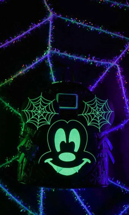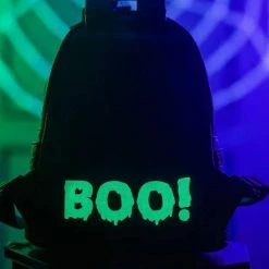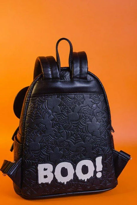 On the front, Mickey Mouse creeps to life in applique and printed details! In the dark, his face bears an eerie glow, as does the “BOO!” found on the back of the bag. Vegan-friendly leather coloured black perfectly compliments the spooky theme, black also frames the bag’s borders, piping, carry handle and shoulder straps. With two side pockets, a main storage compartment and silver-tone hardware, this accessory is perfect for fans to add some spooky Disney flair to any outfit!