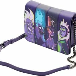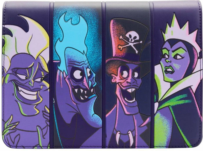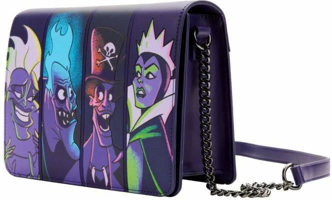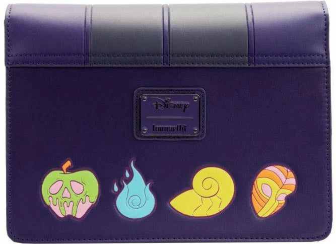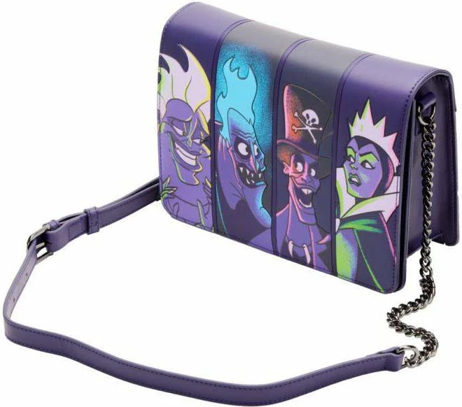 This crossbody bag features four villains as they scheme under the cover of darkness. The sea witch, Ursula, bears a devilish grin while Hades holds a menacing expression. A red glow lights up the Shadow Man, Dr. Facilier, as the evil Queen Grimhilde is highlighted in eerie green. On the back, four symbols representing each villain appear.
