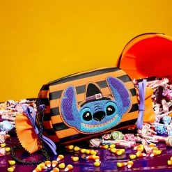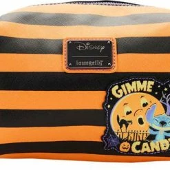 This trickster is ready for a sweet treat! Unwrap some festive fun with the Loungefly Lilo and Stitch Striped Halloween Candy Wrapper Crossbody Bag. Taking the form of a delicious sweet, the front of this appetizing accessory features a chenille patch of Stitch as he wears a witchy Halloween costume. Bows of purple ribbon cinch the ends of the bag’s striped “wrapping,” and a sparkly jack-o’-lantern joins the fun as an enamel zipper charm. Turn the bag around to find a printed applique patch of Stitch saying “Gimme candy!” under a full moon. This confectionary crossbody bag will add extra flavor to any outfit and has plenty of room for storing your tricks and treats. This bag is an officially licensed Disney product.