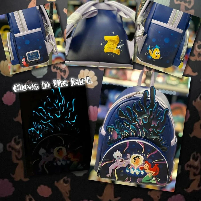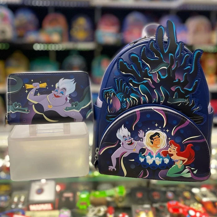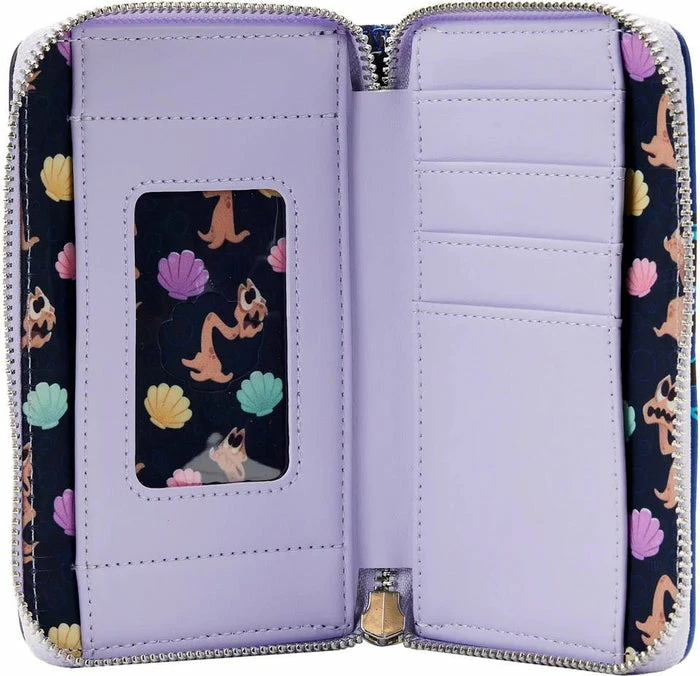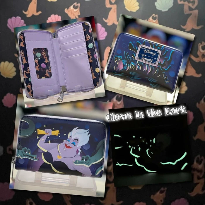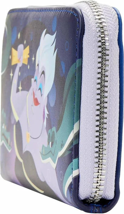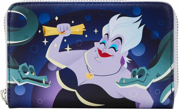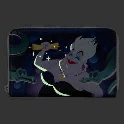 Wrap your tentacles around this Loungefly Disney The Little Mermaid Ursula Lair Zip Around Wallet—before it swims away! On the front, a triumphant Ursula grasps the gold contract that Ariel has signed, and Flotsam and Jetsam surround her. On the back, her intricate lair appears. On both sides of the wallet, glow-in-the-dark details bring Ursula’s outline—as well as the lair’s outline—to life. A die-cut shell shape from Ursula’s necklace adds an bewitchingly evil touch. This wallet is the perfect accessory for any Disney outing—or for turning everyday moments into swimmingly magical adventures!