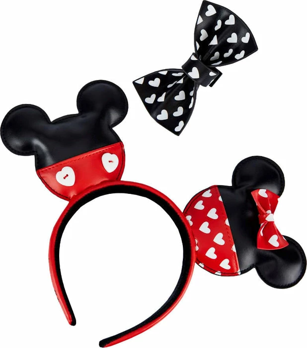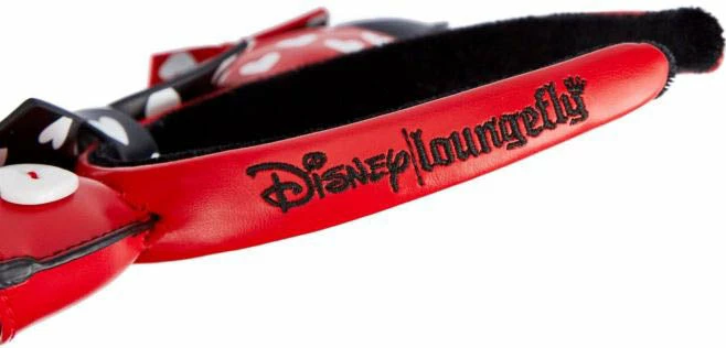 This headband is all kinds of adorable! One ear represents Mickey with real buttons, while the other features Minnie, complete with her signature head bow and dress both adorned in hearts. There’s also the option to accompany the two with a black and white heart-dotted bow! Featuring stunning applique work and a bold red, black and white palette, this is one Loungefly design you won’t want to miss!