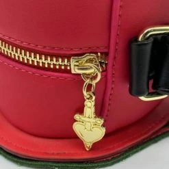 After transforming herself into a seemingly harmless old peddler woman, Queen Grimhilde uses a spell to poison an apple that would ultimately lead Snow White to fall into the Sleeping Death. A patent green glitter applique covers vegan-friendly leather turned red, and embroidered on the back are the Queen’s tempting words; “One bite and all your dreams will come true”. Also featured is a golden zipper charm of a dagger through a heart – shaped after the clasp of the box the Queen believes Snow White’s heart was placed inside of earlier in the film.
