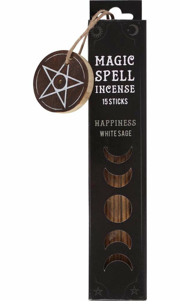 This box of magic spell incense includes 15 white sage scented incense sticks and a matching wooden pentagram holder that is perfect for accompanying spells of balance and happiness. Whether used for spell work or everyday enjoyment, this fragrance will attract all the best things life has to offer.