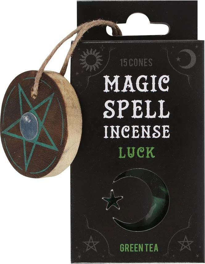 This box of magic spell incense includes 15 green tea scented incense cones and a matching wooden pentagram holder that is perfect for accompanying spells of good fortune. Whether used for spell work or everyday enjoyment, this fragrance will attract all things lucky.