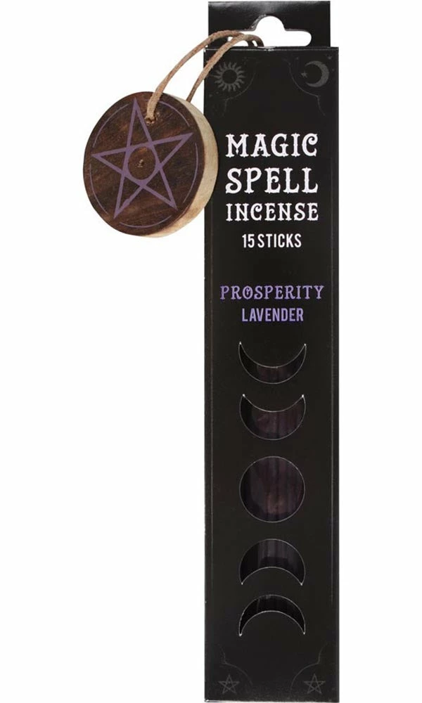 This box of magic spell incense includes 15 lavender scented incense sticks and a matching wooden pentagram holder that is perfect for accompanying spells of growth and prosperity. Whether used for spell work or everyday enjoyment, this fragrance will attract all kinds of success.