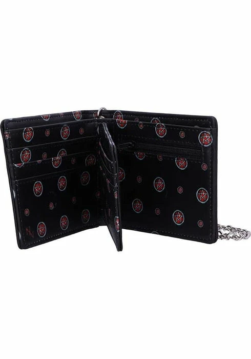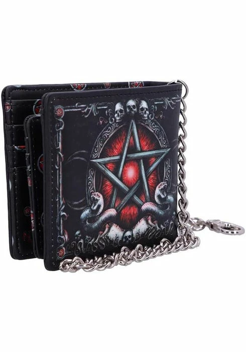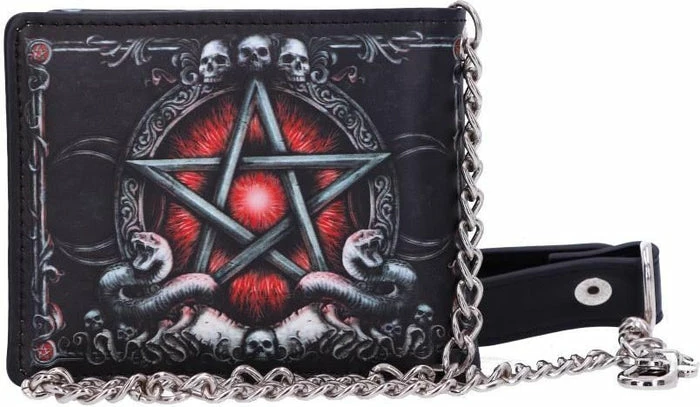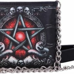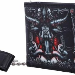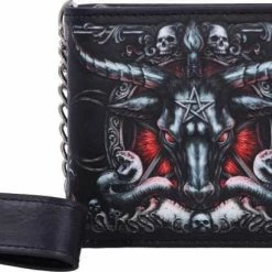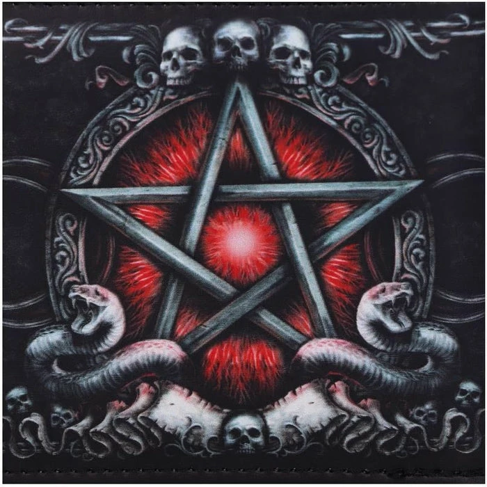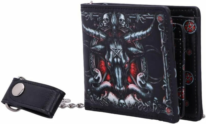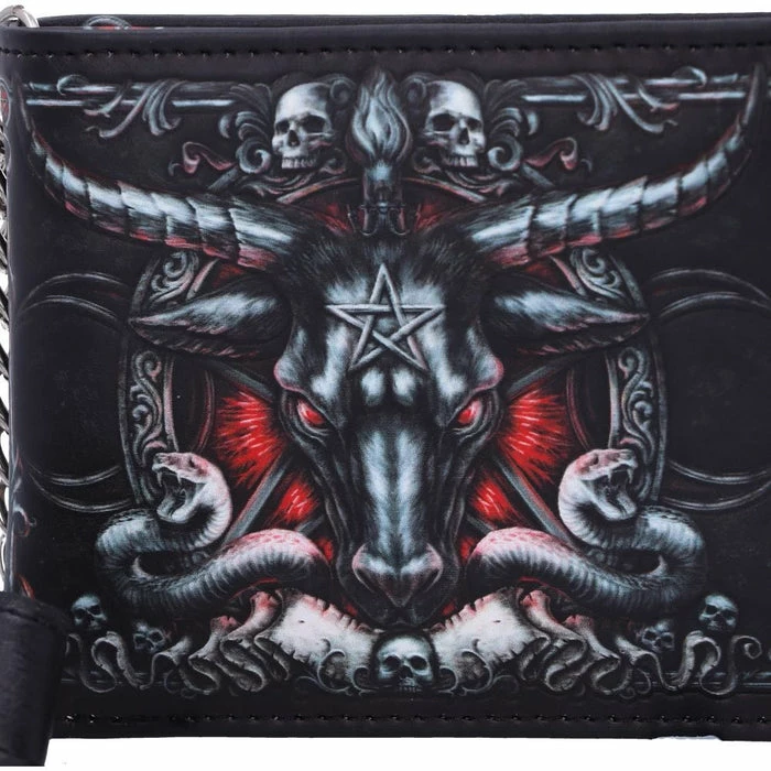 Decorated with the head of a triple-horned Sabbatic Goat with a pentagram raised from its skull, this piece is perfect for those who need to get achieve balance in their lives. Underneath the head, there rests a five-pointed pentagram, surrounded by intricate patterns. Above it, a pair of skulls sit while below it, two King cobras are poised to attack. This masterpiece is perfect for keeping your money safe and features multiple slots for cards and cash.
